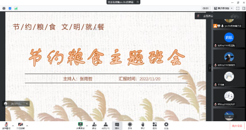 为了积极响应党的二十大关于粮食问题的号召,让同学们树立“力行节俭、反对浪费”的正确观念,材科sy2102班于11月20日19时召开了线上主题班会。会议由班长张雨哲同学主持,材科sy2102班全体同学参会。