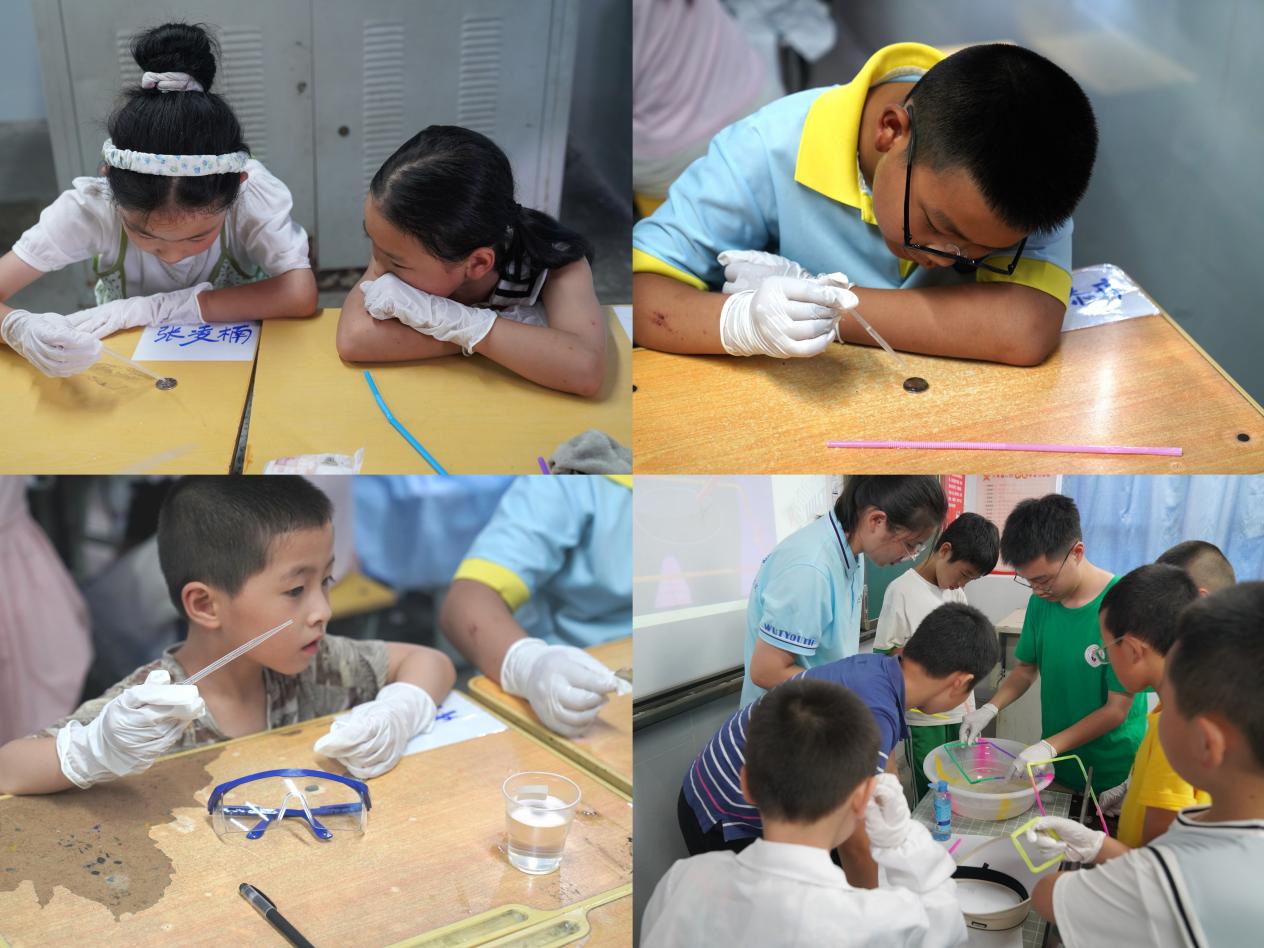 “影响水表面张力的因素有哪些呢?”在同学们对表面张力有了初步的认识后,喻嘉乐老师进一步的提出了更有挑战性的问题。看着同学们百思不得其解的样子,喻老师提示同学们可以从不同种类的液体入手。这一提示点燃了同学们,通过实验,大家发现加入白糖的水表面张力更强。在此基础上,喻嘉乐老师带领同学们一同制作了简易的泡泡机,化无形为有形,让同学们在缤纷的泡泡中体悟自然科学的魅力。
