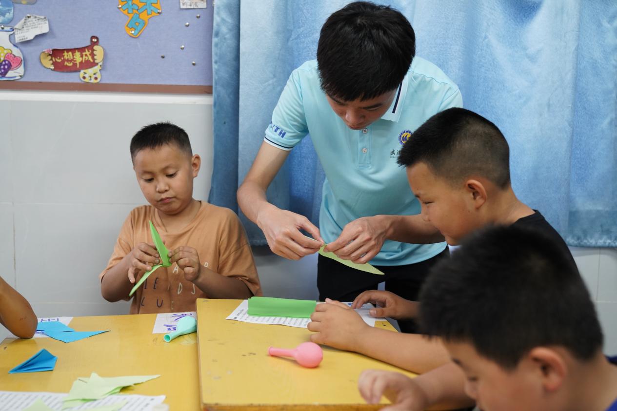 一开始是聚精会神的眼睛,随后是轻快舞动的手指。在实践队队员的带领下,同学们开始动用自己的聪明才智,把自己大脑中的空中楼阁落地。铅笔摩擦纸张的“簌簌”声,剪刀划过泡沫的“咔咔”声,孩子们的欢笑,队员们的温言,快速的交织在一起。